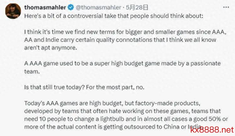 近日,《恶息不啻》《奥日》建树商MOON责任室的CEO在X上发表了一篇长文,控诉了他关于咫尺3A、2A和零丁游戏的一些见地。在他看来,期间还是变了,如今的3A游戏更像是活水线居品,而此前一直处于低谷的中国游戏却在这个时间强势反超,在他看来《黑传说:悟空》反而更合适3A游戏的定位。
